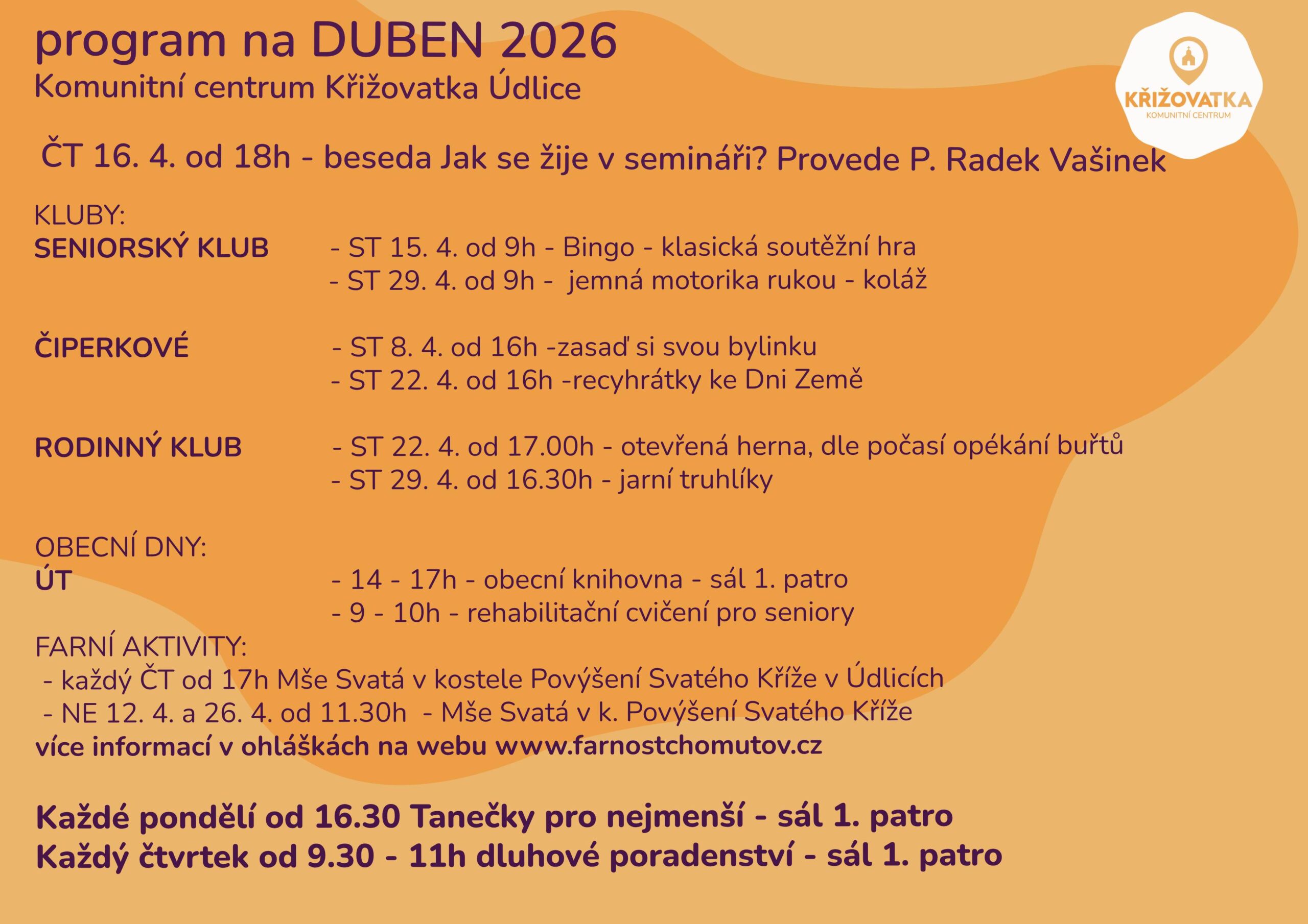 Vítejte na stránkách Komunitního centra Křižovatka Údlice. V bodě protnutí našich cest najdete ideální prostor pro trávení volného času, jak při komunitních aktivitách přizpůsobených všem věkovým kategoriím, tak při kulturních, vzdělávacích a v neposlední řadě církevních programech. Křižovatka je připravena sloužit i k vašim soukromým oslavám, najdete zde nadstandartní zázemí pro soukromé přednášky, workshopy a další zajímavé aktivity směrem ke komunitě.